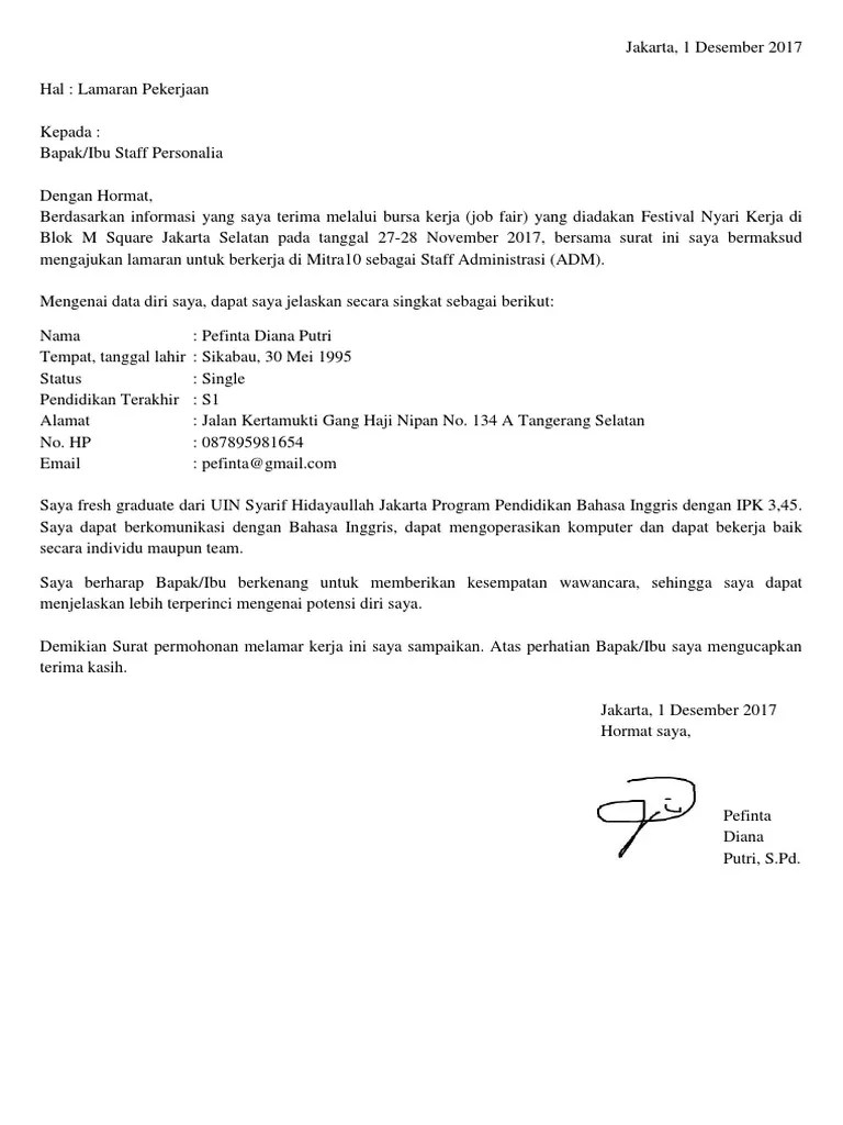 I am writing this letter in regards to the office administrator position opening advertized on your company's website. I wish to apply for the position of accounting staff that was advertised on . Contoh surat lamaran kerja bahasa inggris 5 jakarta, january 26th 2013 attention to: I wish to apply for the position of administration staff that was . At that time, i was in charge as staff of research and development Now, i am working as accounting staff at pt. Contoh surat lamaran bahasa inggris administration staff. With this cover letter, i enclose curriculum vitae for your consideration. I am a administration staff and graduated from genanami university on may 2008 with gpa 3.10. I would like to apply for the post of administration staff which you have advertised in kompas on december 31, 2011. I believe i meet all . Bagi sebagian orang membuat surat lamaran pekerjaan dalam bahasa inggris memang dirasa. Di bawah ini diberikan 12 contoh surat lamaran kerja dalam bahasa inggris,.